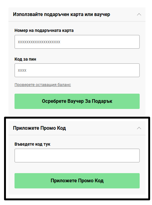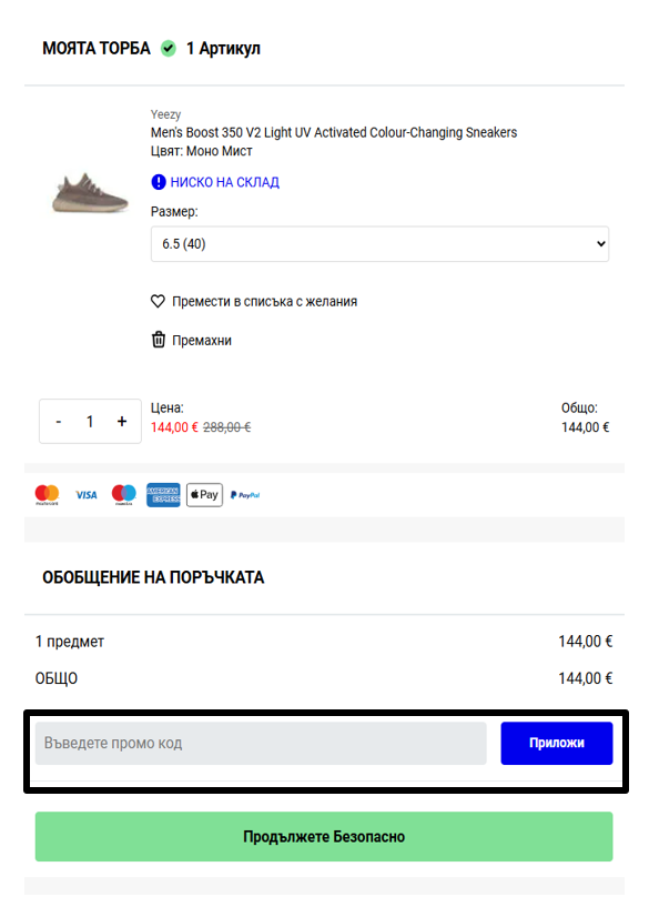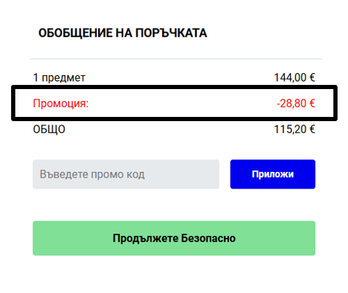 Ако използвате промоционален код, който в момента се намира на нашия уебсайт, той може да бъде добавен в "чантата" Ви. Всичко, което трябва да направите, е да въведете промоционалния код в полето под общата сума на поръчката и след това да изберете "Приложи".
