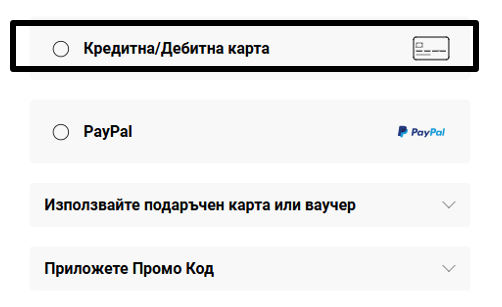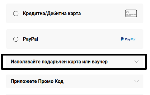 След като изберете опцията за доставка, ще Ви бъдат представени всички налични опции за плащане на поръчката. Изберете Прилагане на промоционален код, въведете предоставения Ви код и след това изберете Прилагане.