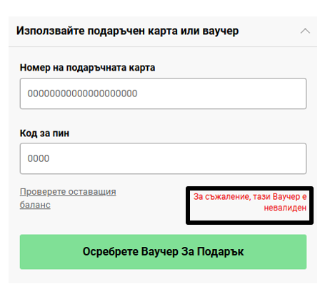 Ако сте сигурни, че използвате валидна карта, моля, опитайте отново със същата кредитна или дебитна карта или направете поръчката отново с друга карта. Ако проблемът продължава, моля, свържете се с доставчика на Вашата карта.
